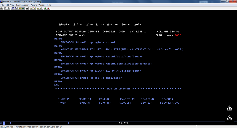 The z/OSMF file system is allocated, formatted, and mounted, and the necessary directories are created.